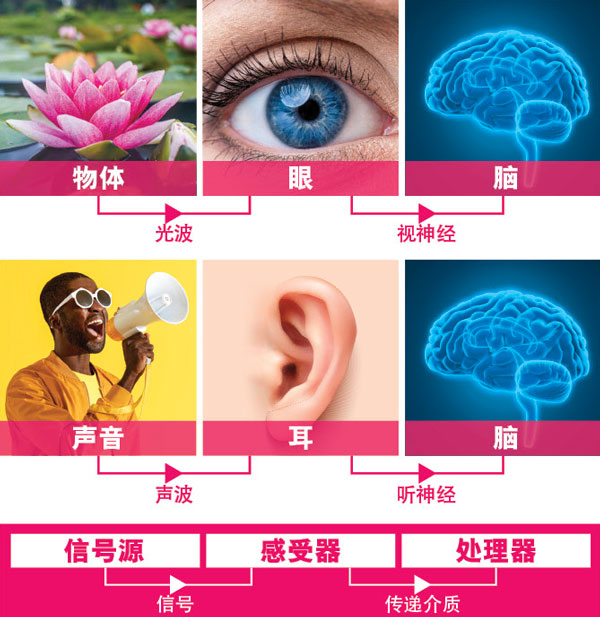 简单地说,味觉系统由一个传感器、一个传递信息的神经和一个处理器组成。大多数人对视觉和听觉系统的构成有基本的认识,如图1中所示。