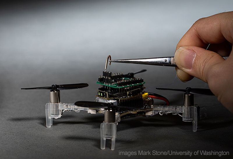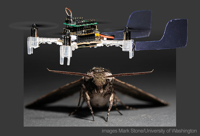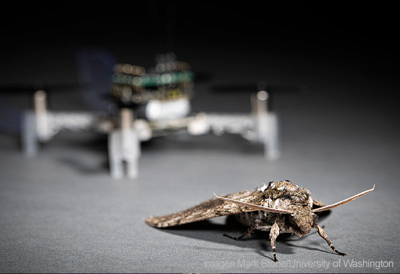 华盛顿大学的工程师将活体鹰蛾的触角连接到他们的无人机上