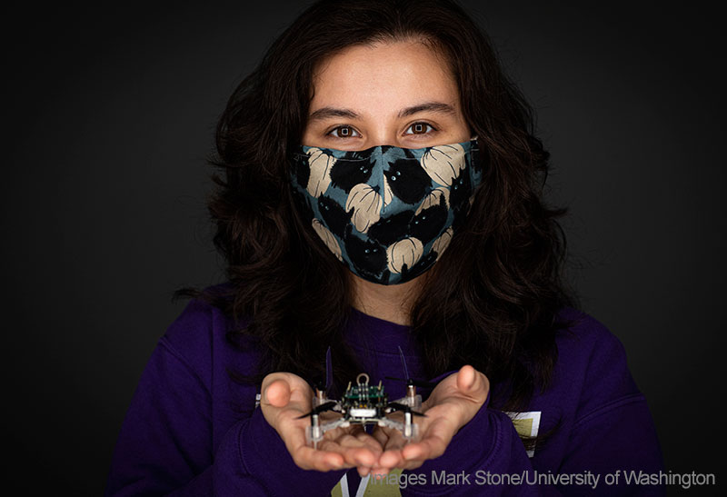 研究论文的主要作者机械工程博士生梅兰妮(她根据当地的新冠病毒疫情防控的要求戴上口罩),拿着嗅觉飞行器