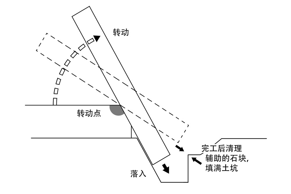 巨石绕着转动点旋转后落入固定其位置的土坑