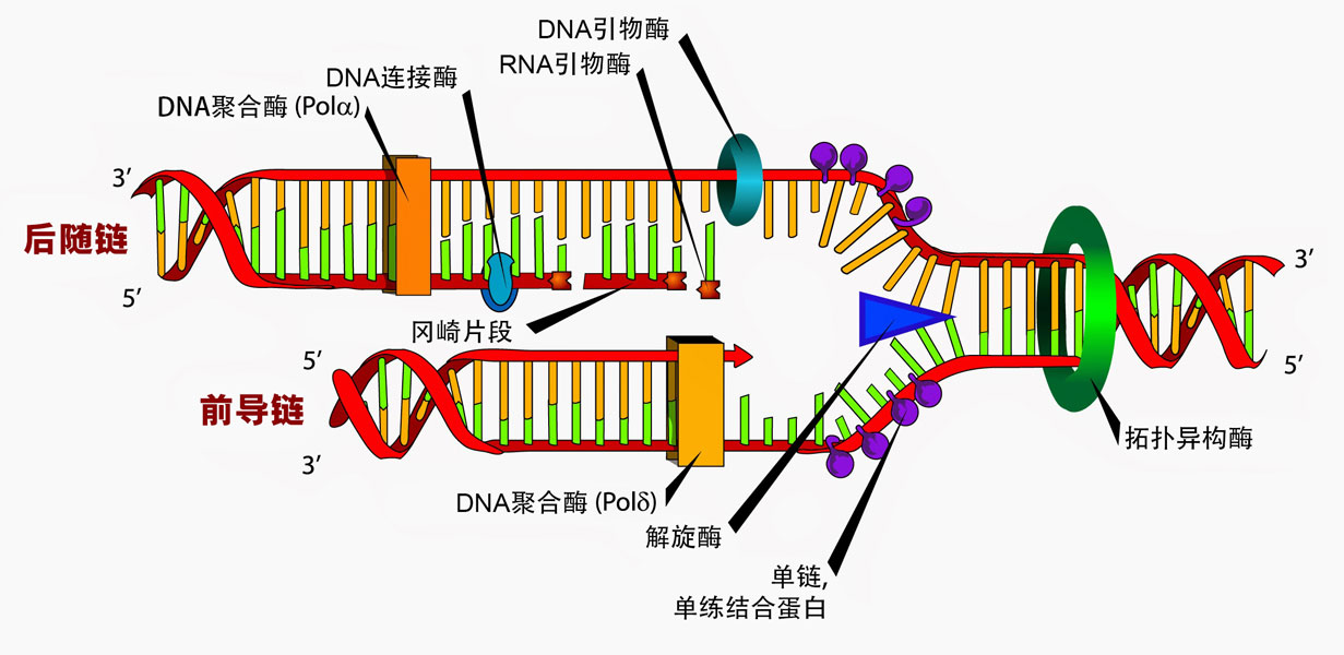 声明:这是一套非常复杂的机器(比如,解旋酶有一个环状结构,能让DNA链穿过),该图将之简化。