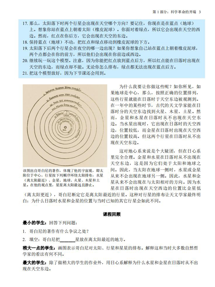 本书以历史为导向介绍科学概念,涉及从1543年到17世纪末的自然哲学家的科学研究。本书谈及科学的发展,所讨论的主题极其广泛,包括天文学、人体解剖学、医学、植物学、动物学、日心说、地心说、气体、压力、电、化石、微生物、二进制数、重力、守恒定律和运动定律等等。通过整个课程的学习,学生将了解到,生活在这一时期的伟大自然哲学家大都是虔诚的基督徒,他们研究周围的世界是为了更多地认识上帝的本质。