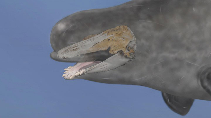 杂交鲸的牙齿较为特殊,很多牙都是“横着长的,有些甚至会沿着独角鲸的角那样弯着长。”4