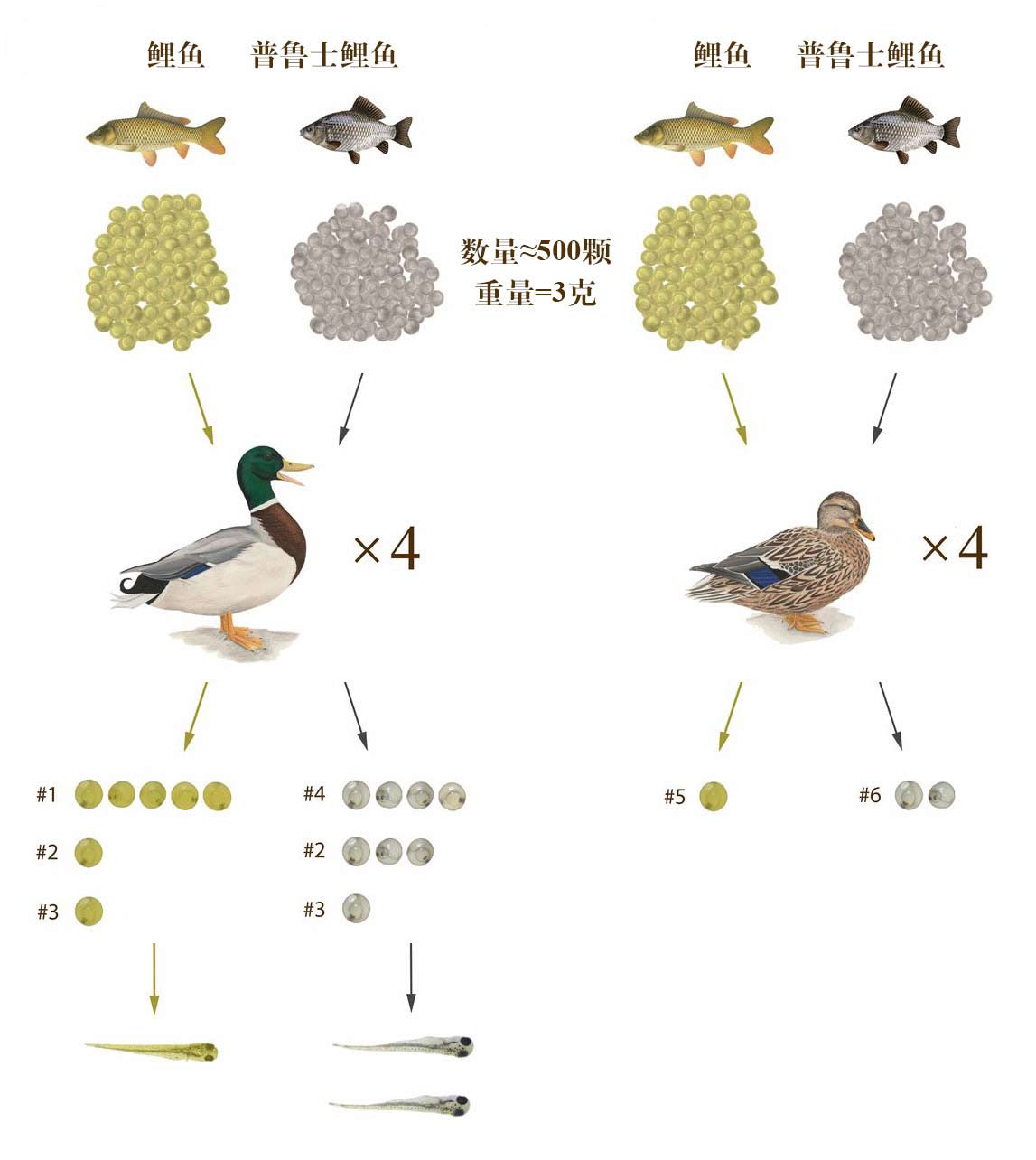 然而,科学家最近研究了圈养的野鸭,他们发现被鸭子吞食后的鱼卵有一小部分仍能存活下来,这些鱼卵通过了野鸭的肠道,还有足够高的存活率,来确保鱼类能成功地散布。这个实验所使用的是普通鲤鱼和普鲁士鲤鱼的鱼卵。现已经发现,昆虫的幼虫、小型植物和种子也可以通过同样的方式进行传播。