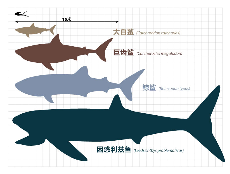 与所有鲨鱼一样,鲸鲨也是软骨鱼,而非硬骨。但鲸鲨和任何其他鲨鱼都不是有史以来最大的鱼类。在fossil-record中发现了最大的鱼,是一种已灭绝的硬骨鱼,叫做“困惑利茲鱼(Leedsichthys questionsus)”。估计它的长度达到 30 米! 1