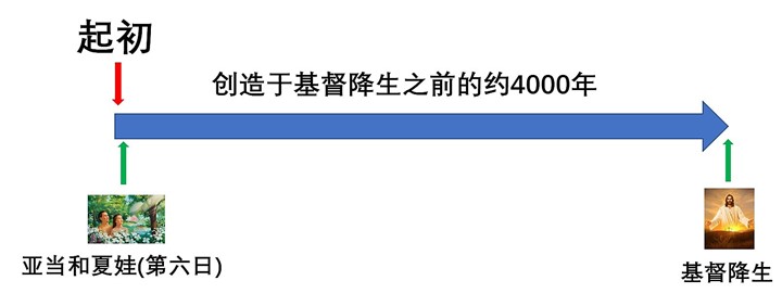 图片左边是起初。从起初到创造亚当夏娃,只是过了6天。也就是说从起初造人,人在为期6日的创造周被造。