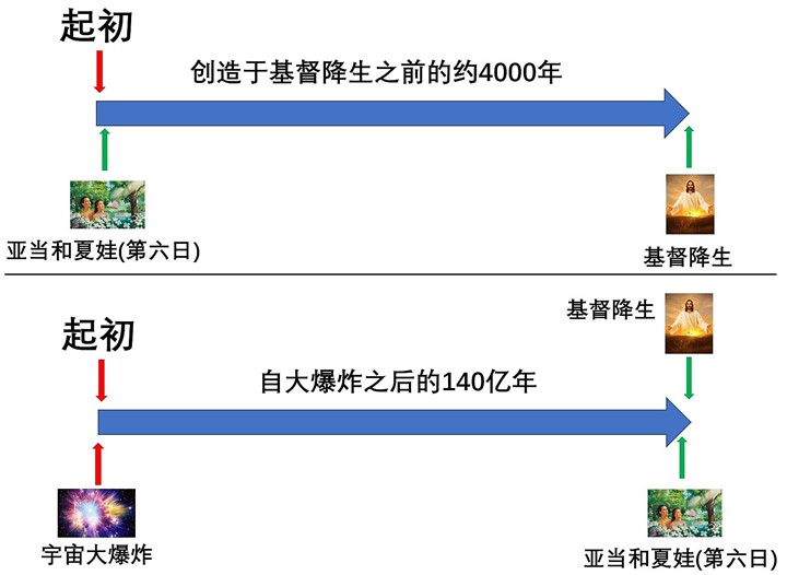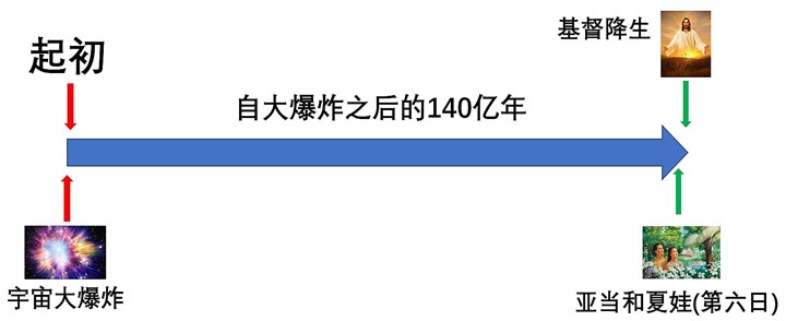 也就是说,亚当夏娃与耶稣基督 一样(上图右边)距离年老地球论所想象的“起初”(上图左边)有140亿年的时间。换句话说,亚当夏娃不可能是在年老地球论的“起初”(宇宙大爆炸)被神创造的