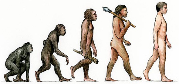 | 图注1:进化论的圣象之一。在从猿到人的进化中,人类原始灵长类祖先的肤色经常被表现为黑色。 |