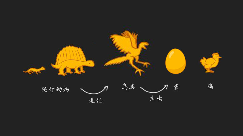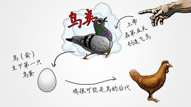 乍看起来,似乎讲得也蛮有道理,但当你仔细思考后,是否发现这个结论并没有确实的依据。比如说那种似鸡非鸡的生物是什么?先不说卵和成虫谁先谁后的问题,虫子与鸡,一个是昆虫,一个是家禽,用来做类比似乎有点牵强。至于数百万年的说法,无法确认,即便如此,要说是进化过程中的其中一个产物,也没有科学证据说明是哪个生物的哪个“进化的阶段”如何(偶然)产生了第一个鸡蛋。